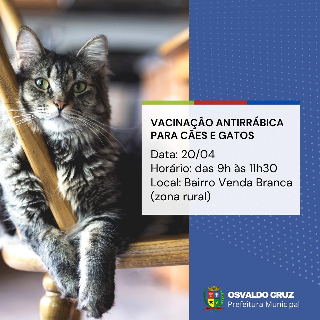 A Prefeitura de Osvaldo Cruz realiza neste dia 20 (quarta-feira) a nova etapa da Campanha de Vacinação Antirrábica, das 9h às 11h30, no bairro Venda Branca, zona rural do município.