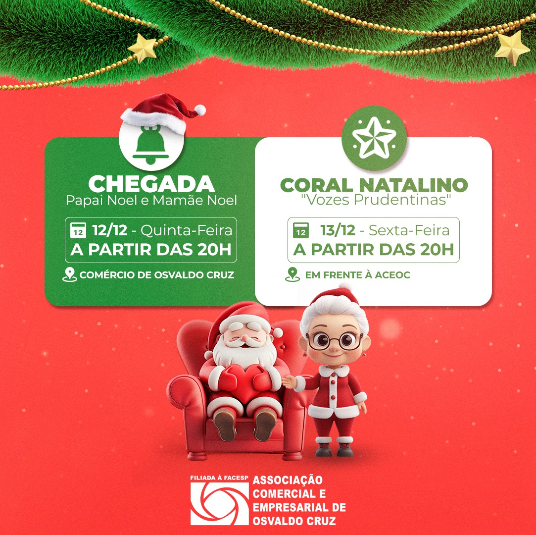 O espírito natalino já está tomando conta de Osvaldo Cruz, e você não pode perder as atrações especiais preparadas para encantar toda a família. Confira a programação e venha comemorar com a gente!