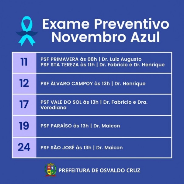 A Secretaria Municipal de Saúde de Osvaldo Cruz realiza dentro do mês de novembro uma série de ações do Novembro Azul, mês de prevenção ao câncer de próstata nos homens.