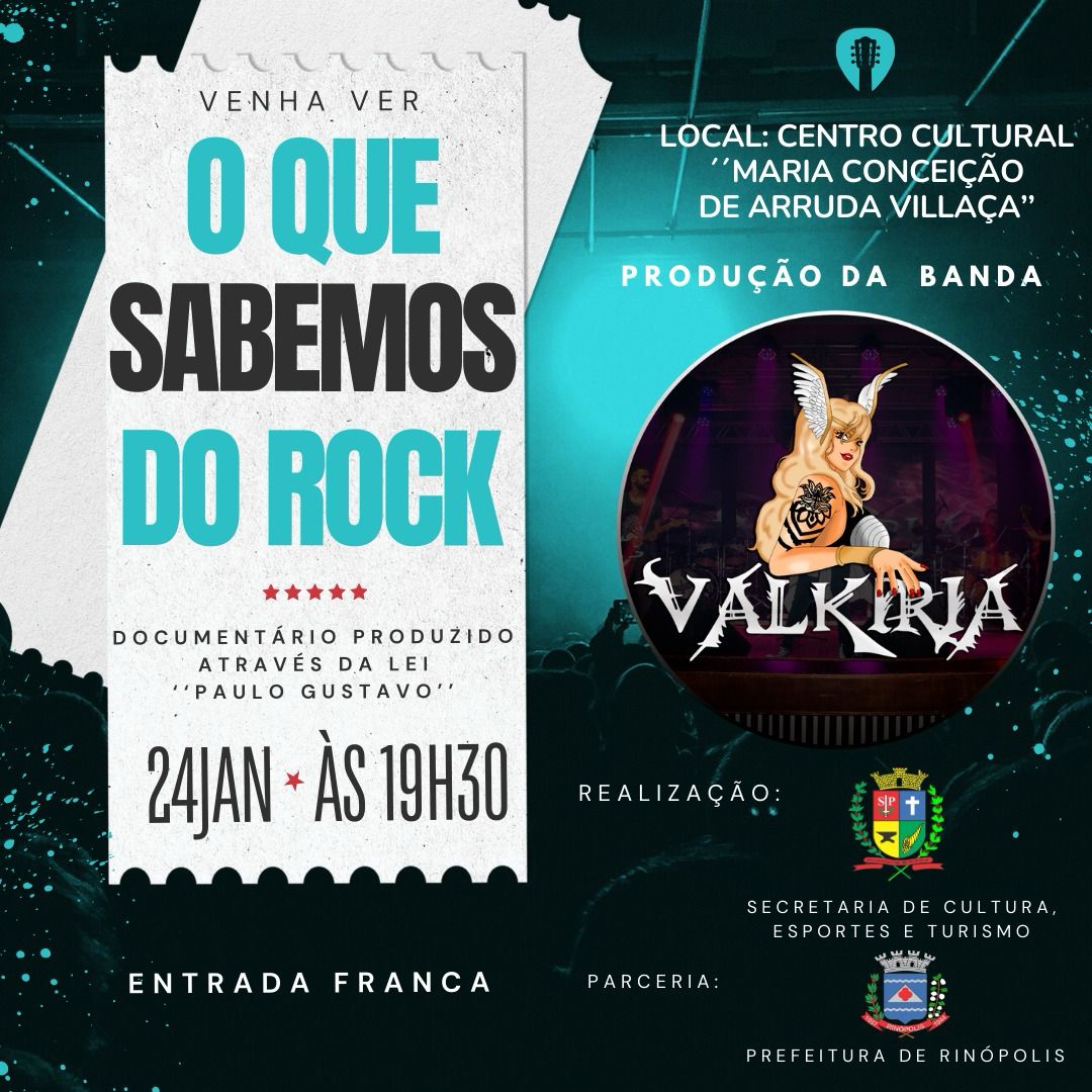 No dia 24, quarta-feira da próxima semana, a Secretaria de Cultura, Esportes e Turismo de Osvaldo Cruz apresentará o documentário “O que Sabemos do Rock”, produzido pela Banda Valkíria com apoio da Lei Paulo Gustavo e verba da Prefeitura de Rinópolis.
