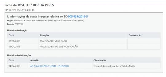 O pré-candidato a Prefeito de Salmourão, José Luis Rocha Peres (PP), é o único político entre os pretendentes a cargos do Poder Executivo de cidades da região de Osvaldo Cruz a aparecerem na lista de 7.354 gestores, que tiveram contas julgadas irregulares. Em tese o político pode ser declarado inelegível este ano.