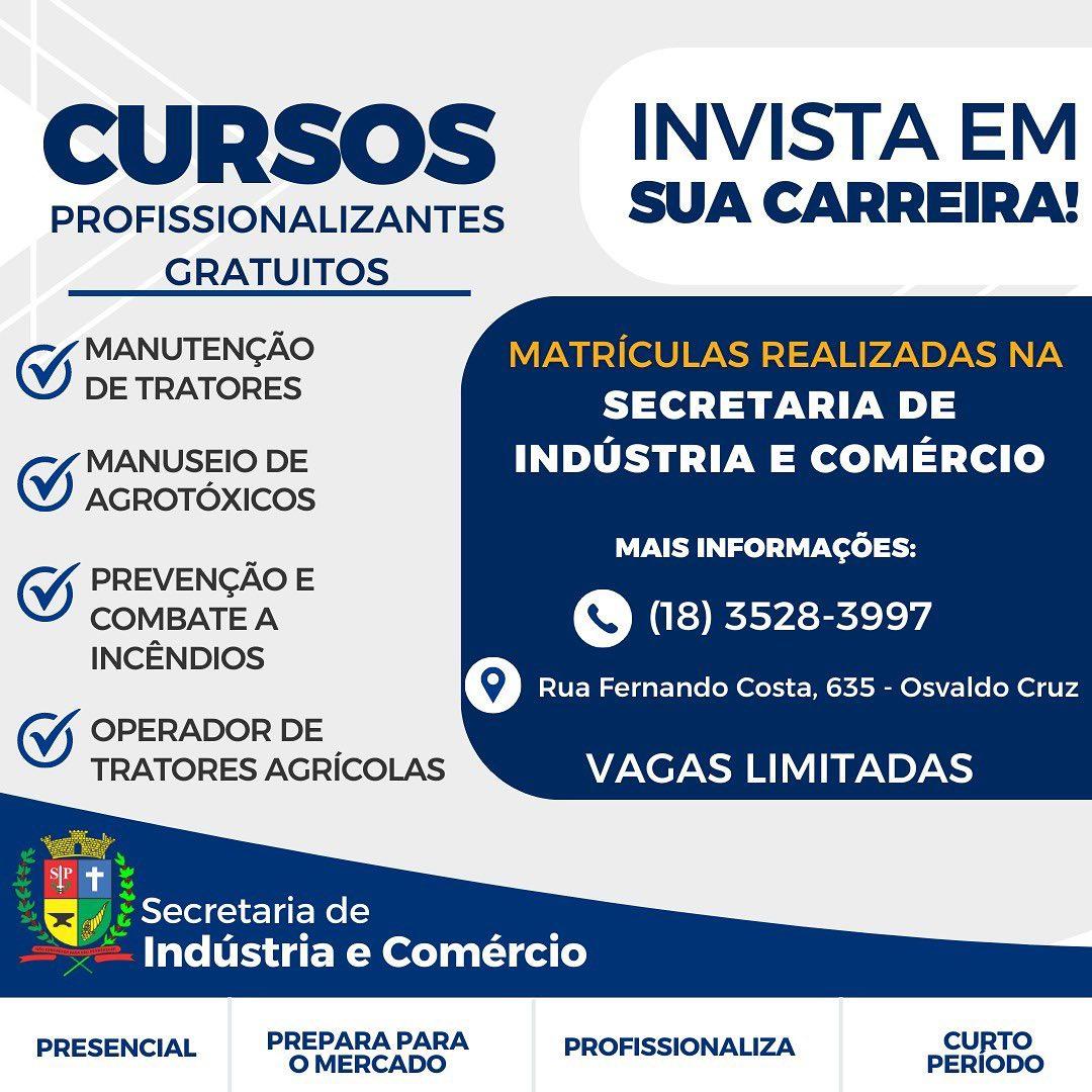 A Prefeitura de Osvaldo Cruz através da Secretaria de Indústria e Comércio disponibiliza vagas para vários cursos profissionalizantes gratuitos.
