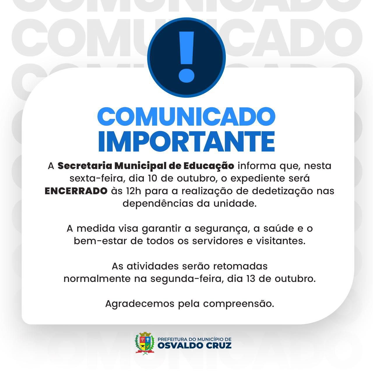A Secretaria Municipal de Educação de Osvaldo Cruz divulgou um aviso importante sobre o encerramento antecipado do expediente nesta sexta-feira, 10 de outubro, às 12h, devido à realização de dedetização nas dependências da unidade.