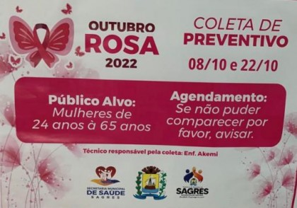 Secretaria Municipal de Saúde de Sagres anuncia nova data para coletas de exames da campanha “Outubro Rosa 2022”.