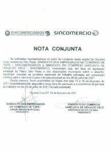 O Sincomercio de Osvaldo Cruz e o Sindicado dos Empregados no Comércio de Tupã (Sincomerciários), anunciaram em nota conjunta a suspensão das folgas previstas para os dias 15 e 16 de fevereiro (Carnaval).