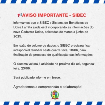 O Sistema de Benefícios do Bolsa Família (SIBEC) continuará fora do ar nesta quarta-feira (18/06) para conclusão do processo de atualização dos dados do Cadastro Único, coletados entre março e junho deste ano. De acordo com informações oficiais, a manutenção é necessária devido ao grande volume de informações que estão sendo qualificadas.