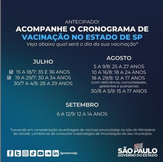 O Governador João Doria anunciou nesta quarta-feira (28) a antecipação do calendário de vacinação contra a COVID-19 no Estado de São Paulo. A conclusão da imunização dos adultos deve ocorrer em 16 de agosto, quatro dias antes da previsão anterior. Adolescentes também terão vacinação antecipada.