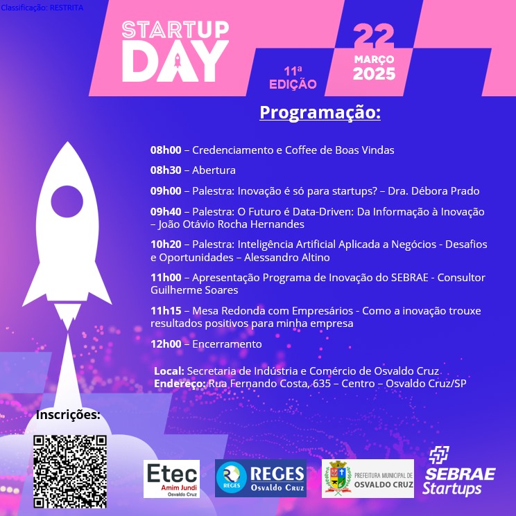 Segue o link para inscrição: https://www.sympla.com.br/evento/startup-day-osvaldo-cruz-2025/2862114