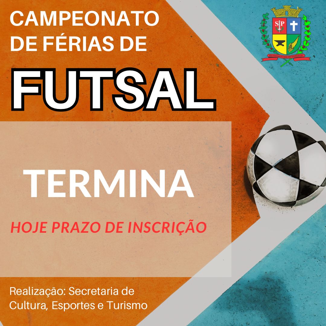 A Secretaria Municipal de Cultura, Esportes e Turismo informa que hoje, 8, é o último dia para se inscrever no Campeonato de Férias de Futsal Masculino Categoria Livre.