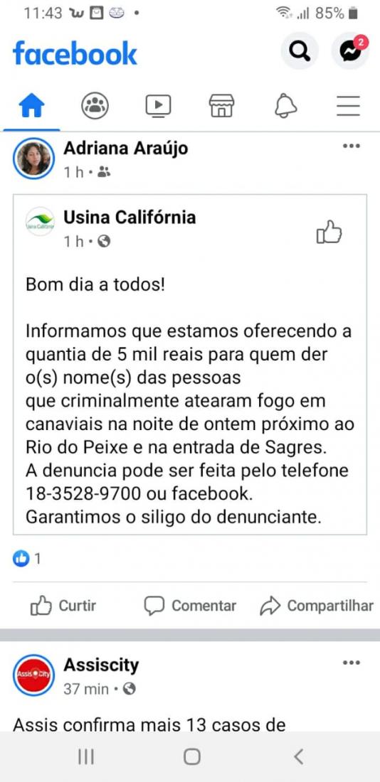 A Usina Califórnia de Parapuã ofereceu pelo Facebook uma recompensa de R$ 5 mil para quem tiver informações sobre autores de dois incêndios criminosos registrados neste domingo (21) por volta das 21h30 em canaviais pertencentes da empresa.