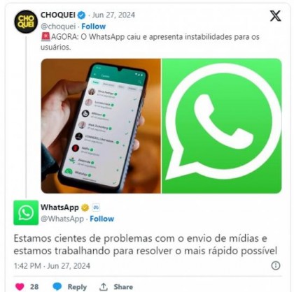 Pelas redes sociais, o WhatsApp informou que está ciente de problemas com o envio de mídias e estamos trabalhando para resolver o mais rápido possível.